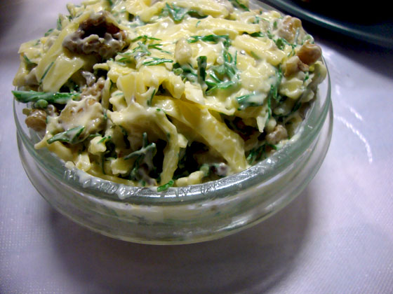 Для этого нужно смешать тертый сыр, укроп, грецкие орехи, давленный чеснок ( я предпочитаю мелко нарубить), и заправить начинку белым соусом или как еще называют бешамель. Так же можно заправить майонезом, но я бы не советовала.