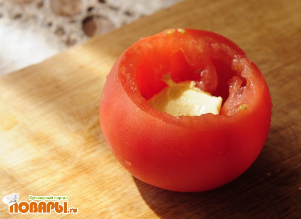 Помидор лучше взять не очень спелый. Аккуратно срезаем верхнюю часть помидорки, чайной ложкой собрать всю серединку. Посолить, немножко растереть по стенке помидора соль.
