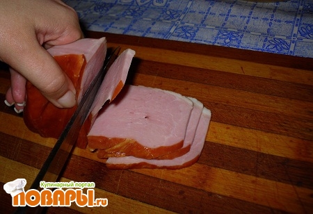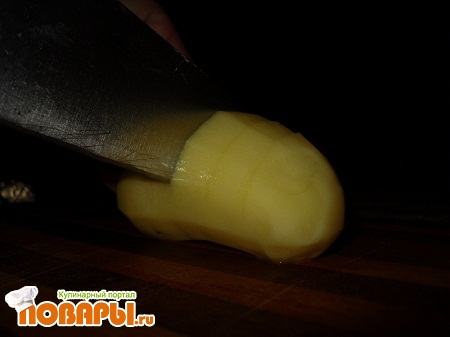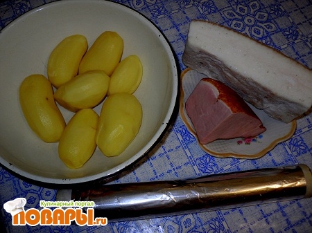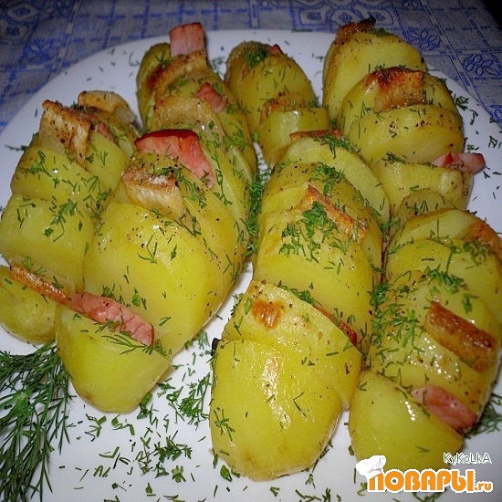 Чередуя мясо с салом, поместите ломтики в разрезы на картофеле. Затем посолите и посыпьте приправой