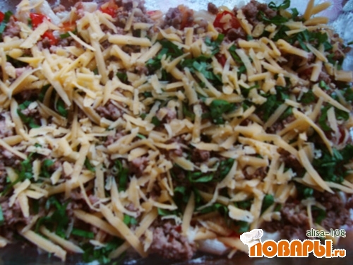 Потом опять выложить вторую часть макарон, томатную подливу и мясной фарш,все присыпать сыром.