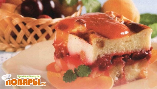 Поверхность запеканки смажьте смесью яйца со сметаной. Запекайте 40 минут при 200 °С. При подаче полейте запеканку абрикосовым соусом или вареньем.