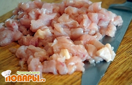 Куриное филе порезать мелкими кубиками или пропустить через крупную мясорубку. Филе можно так же отбить и после порезать, так оно будет мельче.