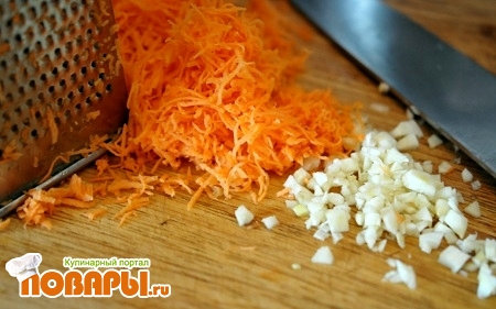 Чеснок почистить, помыть, пропустить через чеснокадавку или мелко порезать. Количество чеснока может зависит от ваших личных предпочтений. Но не меньше 3-4 зубчиков.