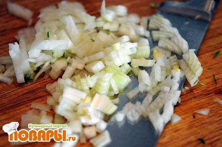 Для нашего блюда нам понадобится много зелени, от его количества зависит сочность и вкус блюда. У меня пучок укропа, петрушка и лук порей. Всю зелень нужно порезать мелко, но не измельчить, так чтобы зелень в процессе готовки могла не только отдать свои соки, но и сама осталась сочной.