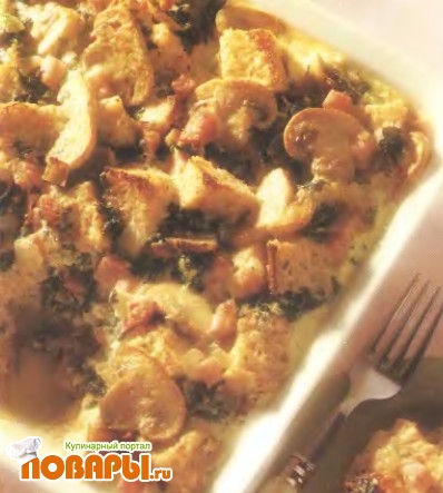 В большой кастрюле смешать молоко, яйца, горчицу, сыр рикотта и пармезан. Затем добавить ветчину, хлебные кубики, смесь из жареных грибов, чеснока и шпината.