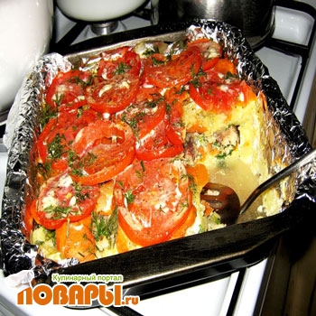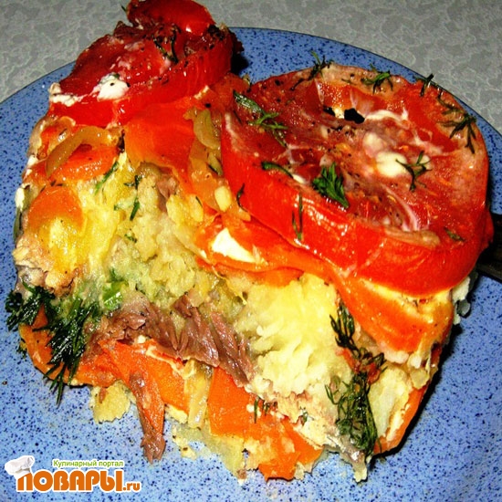 Выложить слои : картофельное пюре, лук, консервированная сайра, морковь, лук, кружочки помидоров. Если картофель варили с добавлением соли, то слои можно не солить, а только посолить соус. Для соуса взбить вручную или блендером яйца и сметану (майонез), что есть в наличии.
