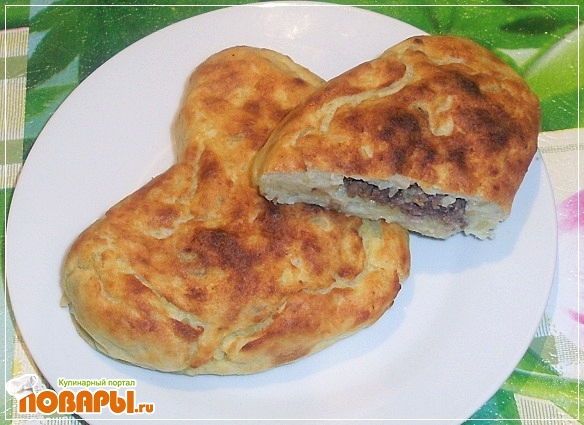 Разделить пюре на пять частей. Из каждой части сделать лепешку, выложить начинку из фарша и слепить "пирожок" в виде сердца и выложить на противень.