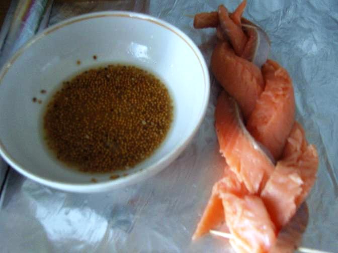 Косичка из сёмги. Филе сёмги нарезать на длинные тонкие полоски. Заплести косичку и сколоть концы зубочистками. Готовим маринад : чайную ложку меда смешать с зернами горчицы и соком лимона.