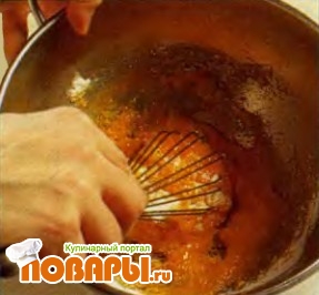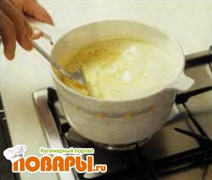 Соедините в кастрюле с закругленным дном желтки с сахаром и взбейте их венчиком до получения светлой пены.