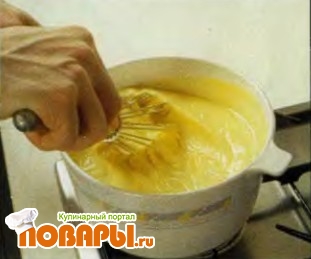 Перелейте крем в кастрюльку, поставьте на самый слабый огонь и доведите до кипения, помешивая сначала лопаточкой, чтобы крем не пристал ко дну, затем - венчиком.