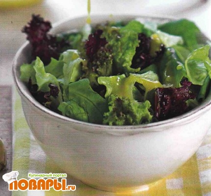 Листья салата крупно нарвите руками, положите в салатницу, полейте заправкой и перемешайте.