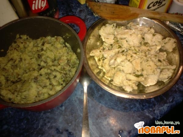 Приготовить любую несладкую начинку (у меня - вареный картофель с жареными грибами и поджаренное куриное филе):