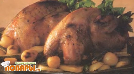 Вынуть фазанов из сковороды и переложить на подогретое сервировочное блюдо.