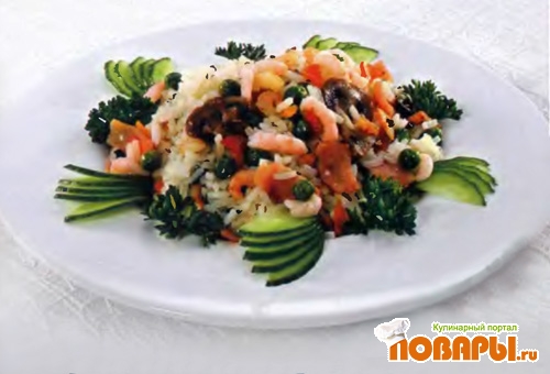 Креветки, ветчину, грибы, морковь и черемшу обжарьте на масле, добавьте зеленый горошек, рис, глютамат натрия, соль, все перемешайте и жарьте еще 2-3 минуты.