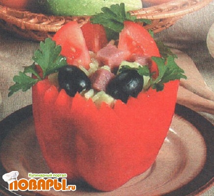 Салат укладывают в корону из перца и украшают маслинами и зеленью петрушки.