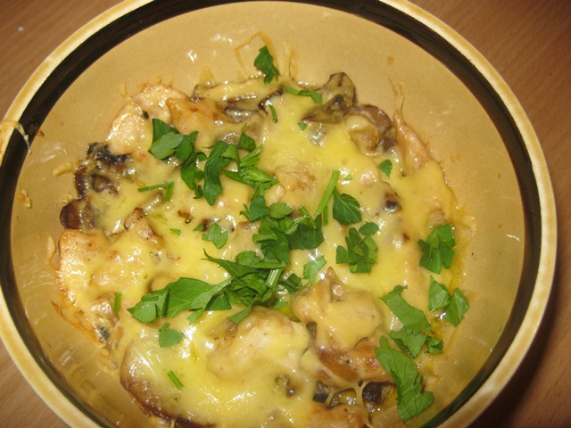 Расформировать по порционным жаростойким тарелкам, посыпать тертым на крупной терке сыром. Запечь 15 – 20 минут при температуре 200 С.