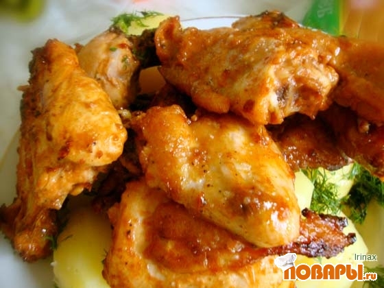 Противень смазать растительном маслом, выложить замаинованные куриные куски, и выпекать при 200 градусов, около 40 минут.