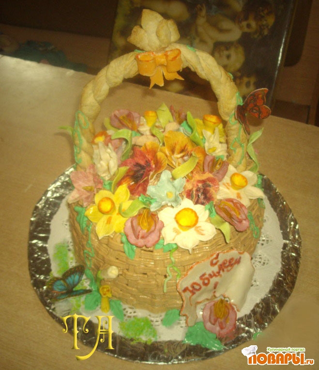 Украшение "плетенка"делается из маслянного крема кондитерским мешочком.Ручка выпекается из готового слоенного теста.Цветы сделаны из мастики.
