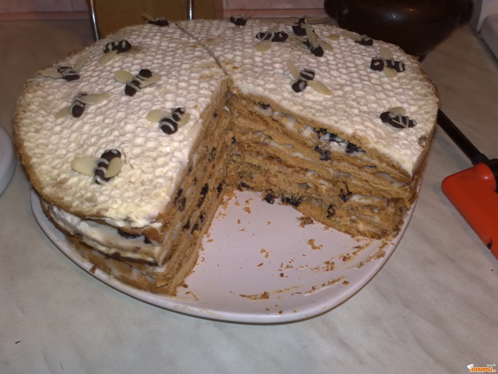 На водяной бане смешать яйца,сахар,мед,масло,влить водку.Когда растворится добавить соду.Затем по одному стакану всыпать муку и заварить тесто.