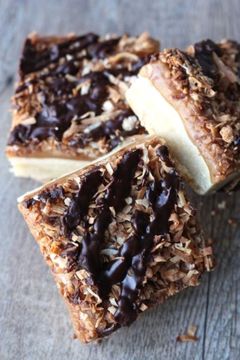 Снять с огня и залить карамелью корж. Пока карамель не остыла, посыпать поверхность поджаренной кокосовой стружкой. Убрать в холодильник минимум на 2 часа.