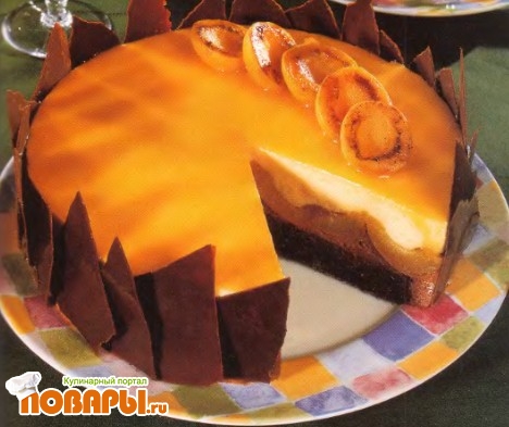 Осторожно удалите форму, обложив ее смоченной в горячей воде салфеткой или проводя лезвием ножа между внутренней стороной формы и тортом. Приклейте сбоку по окружности торта осколки шоколада, полученные из распределенного по пергаментной бумаге слоем в 2 мм шоколада для глазури, который после застывания разбивают. При желании украсьте торт половинками абрикосов и подавайте.