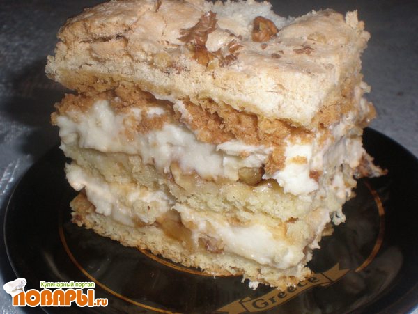 Взбить белки до твердых пиков, добавить сахар, ещё раз взбить. Раскатать корж, смазать его сверху 1/3 частью белка, посыпать рублеными грецкими орехами или арахисом. Испечь до готовности. У меня получается 3 коржа на протвине 25 на 30 см.