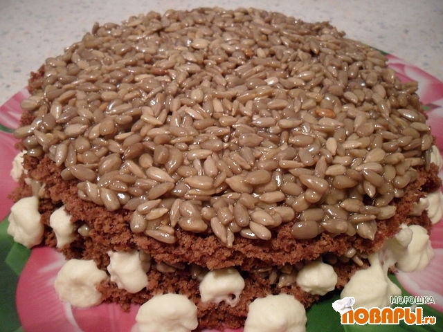 Все ингридиенты для крема смешать в кастрюльке,поставить на медленный огонь.Растворить сахар. И потом всыпать семечки.Уваривать несколько минут.Ещё тёплым промазать торт.