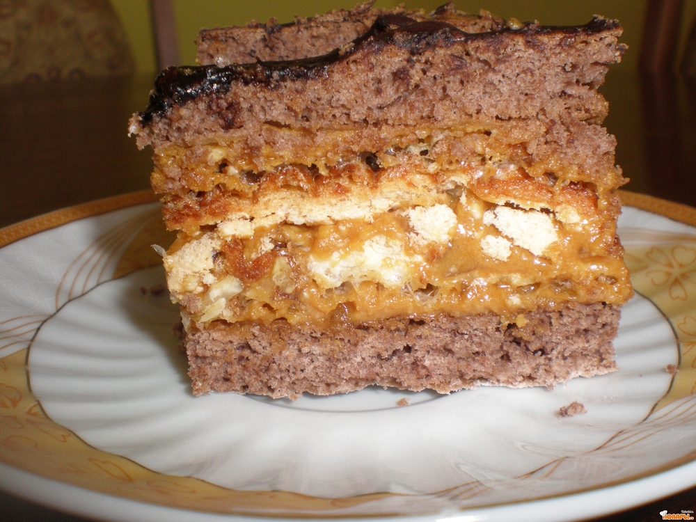 Выложить на 2 квадратных вафельных каржа, посыпать рублеными грецкими орехами или арахисом. Запечь в духовке. Оставить до полного выстывания.