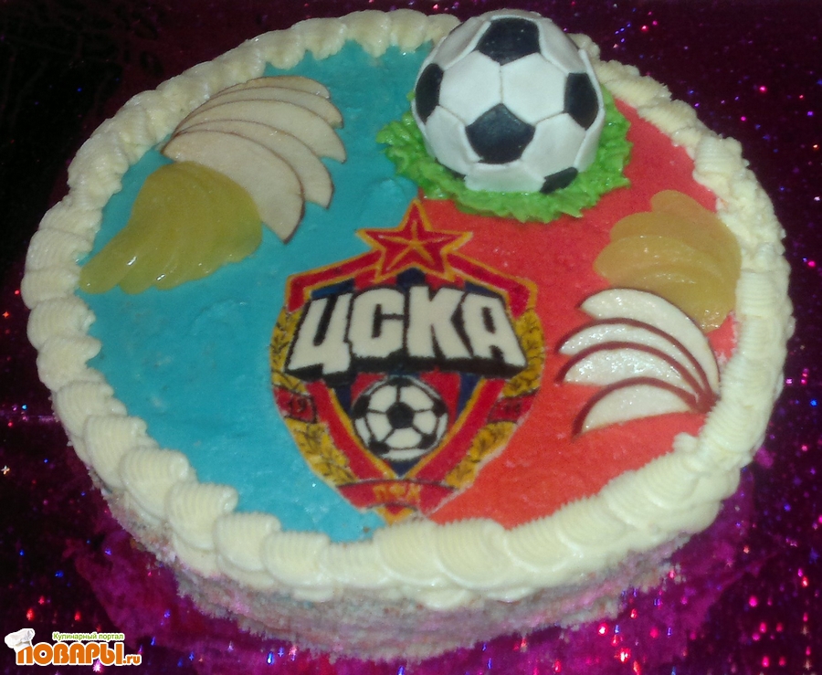 Отделка торта: боковые стороны торта смазывают масляным кремом, посыпают бисквитной крошкой, на поверхность наносят рисунок из крема, украшают эмблемои "ЦСКА" и футбольным мячиком из сахарнои пасты (для лучшего прикрепления мяча на торт из кондитерского мешка наносят масляный крем в виде травы), фруктами в желе (яблоки, персики)