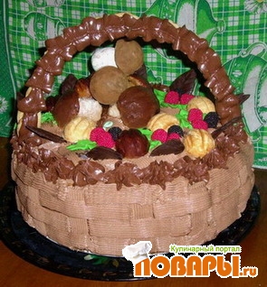 Плетёнка на торте сделана из масляного крема, орешки - печенье в форме с варёной сгущёнкой. Грибочки - из теста для пирожных "Картошка", в шляпки добавляла какао. Ручка из слоёного теста.