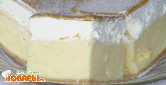 КРЕМ: Для приготовления ванильного крема смешиваем молоко, желток, содержимое пакетика для изготовления пудинга, разрезанную вдоль ванильную палочку, сахар, муку и при постоянном помешивании варим на небольшом огне до загустения. Снимаем кастрюльку с плиты и вынимаем ванильную палочку. Тут же взбиваем белки с сахаром до состояния очень густой пены и аккуратно вмешиваем ее в еще горячий пудинг. Заливаем смесью один из заранее разрезанных надвое коржей и оставляем остывать. В сливки засыпаем сахарный песок и закрепитель, взбиваем в густую пену и разглаживаем ее по поверхности пудинга.