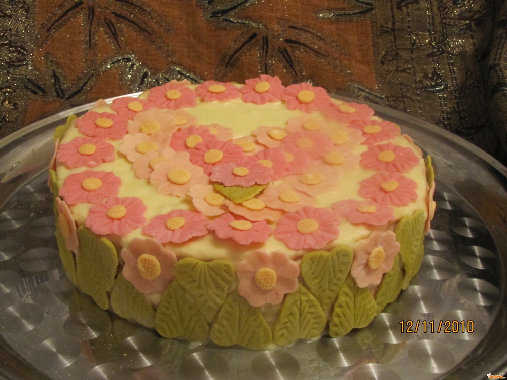 Украшение: все от фантазии зависит. Можно дробленым орехом присыпать, а сверху клубнику положить. Я сверху обмазывала сгущенкой со сливочным маслом и клала украшения из мастики.