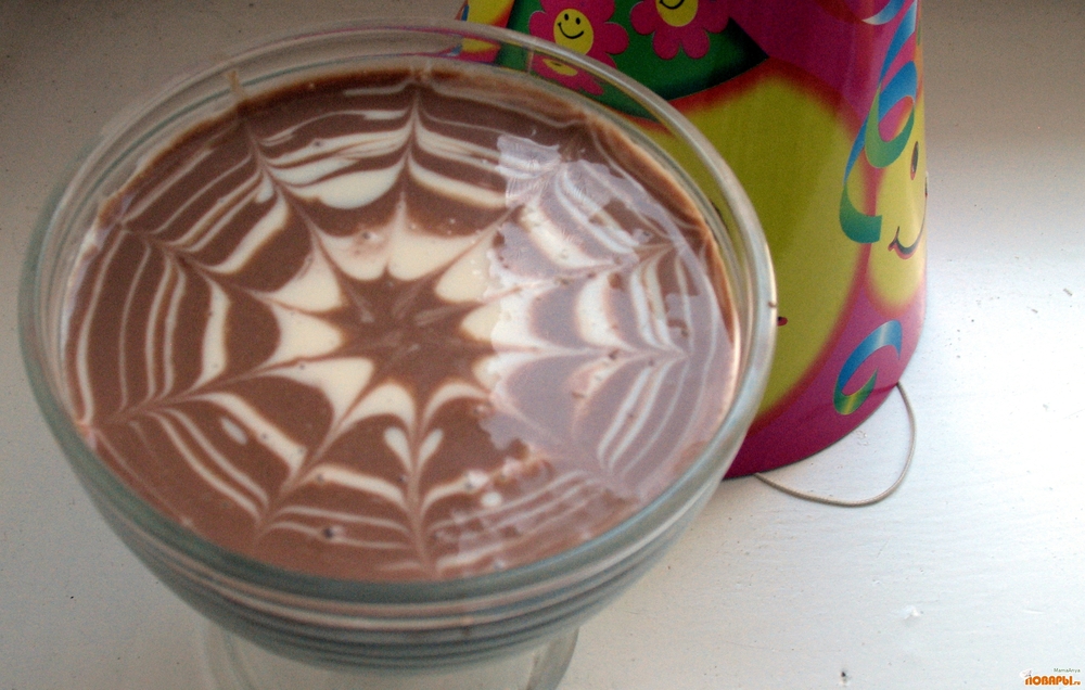 А теперь самое главное - красиво оформить наш десерт. Для этого взять прозрачную посуду и в нее столовой ложкой вливать по-очереди коричневую и белую смесь (по две ложки). Лить слои нужно строго поцентру, тогда будут получатся цветные круги.