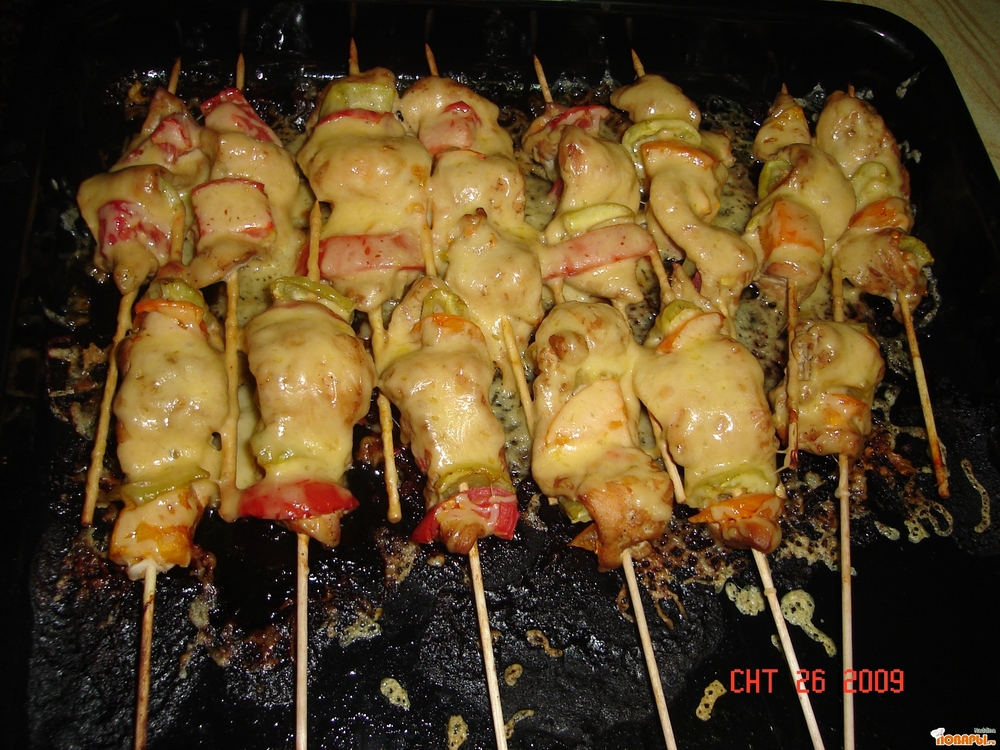 Нанизывать на шпажки филе волнообразно, между волнами нанизывать помидор и перец.