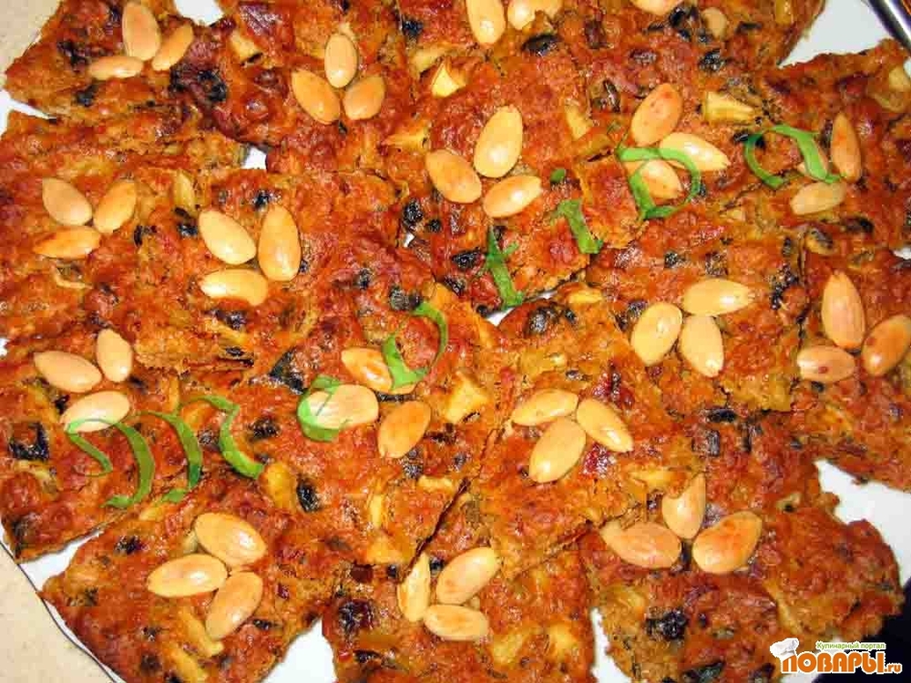 Противень застелить бумагой для выпекания, выложить смесь, аккуратно разровнять и украсить миндалем (одно целое ядрышко, а по бокам две половинки)