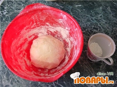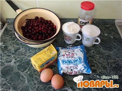 форму посыпаю мукой, выкладываютесто тонким слоем и с высокими бортиками, чтобы вишневый сок не вытек
