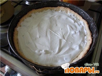 когда тесто почти готово, выкладываю поверх вишни взбитые белки, но не касаюсь бортиков формы! обратно в духовку на 10-15 мин