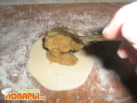 Все ингредиенты для теста смешиваем, и добавляем муку пока тесто не станет пригодным для раскатки. Делим тесто на равные кусочки (я поделила на 24, люблю тоненькое тесто в пирожках). Каждый кусочек раскатываем, в серединку кладем совершенно остывшую начинку.