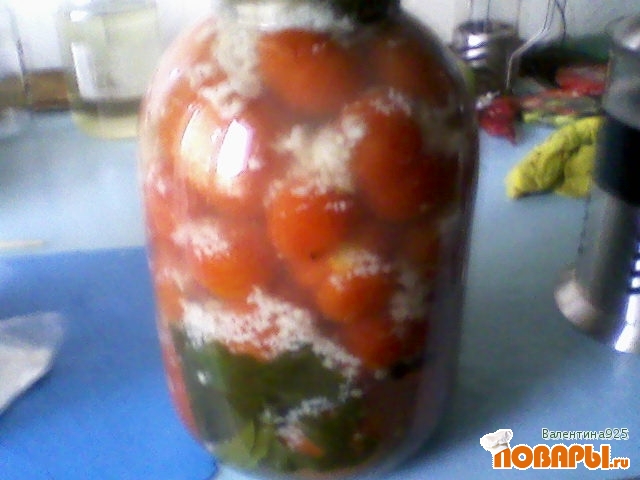 уложисть помидоры с приправами в трехлитровую банку,залить кипятком,и оставить на 10 мин.,затем слить воду в емкость и добавить туда сахар ,соль,уксус как закипит вода,перед тем как залить маринад в банку положить 2-3 ст.л.давленного чеснока,залить маринадом и закатать.