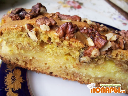 Залить все пудинговой начинкой. Оставшееся тесто разложить поверх начинки. Не старайтесь добиться равномерности при выкладке теста, не получится. Оно выкладывается эдакими островочками. Пусть это вас не смущает, в духовке всё выровняется.