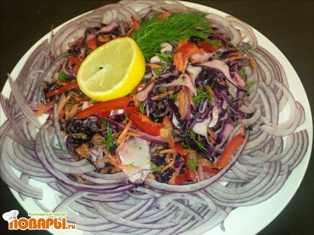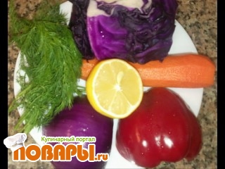 На той же тёрке,что использовали для капусты, натрите перец и красный лук. Добавьте в капусту перец, сок половинки лимона, мелко нарезанный укроп, чёрный перец, соль и оливковое масло.