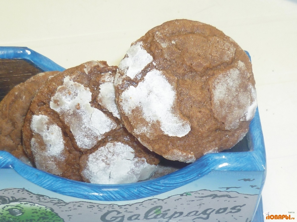 Долго не мешать, а то печеньки станут дубовыми. Полученное тесто поставить в холодильник на час. После этого сформировать шарики с орешек, обвалять их в сахарной пудре и выложить на лист, выстеленый пекарской бумагой на расстоянии друг от дружки, печеньки расплываются. Выпекать при 170º около 15 мин.