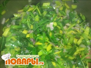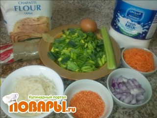 Обжарить не сильно лук репчатый с луком пореем, добавить морковь, через некоторое время промытую чечевицу и картофель. Нужно дать немного подрумяниться картофелю, но не дать пригореть. Добавляем кипяток и оставляем варится до разваривания чечевицы.