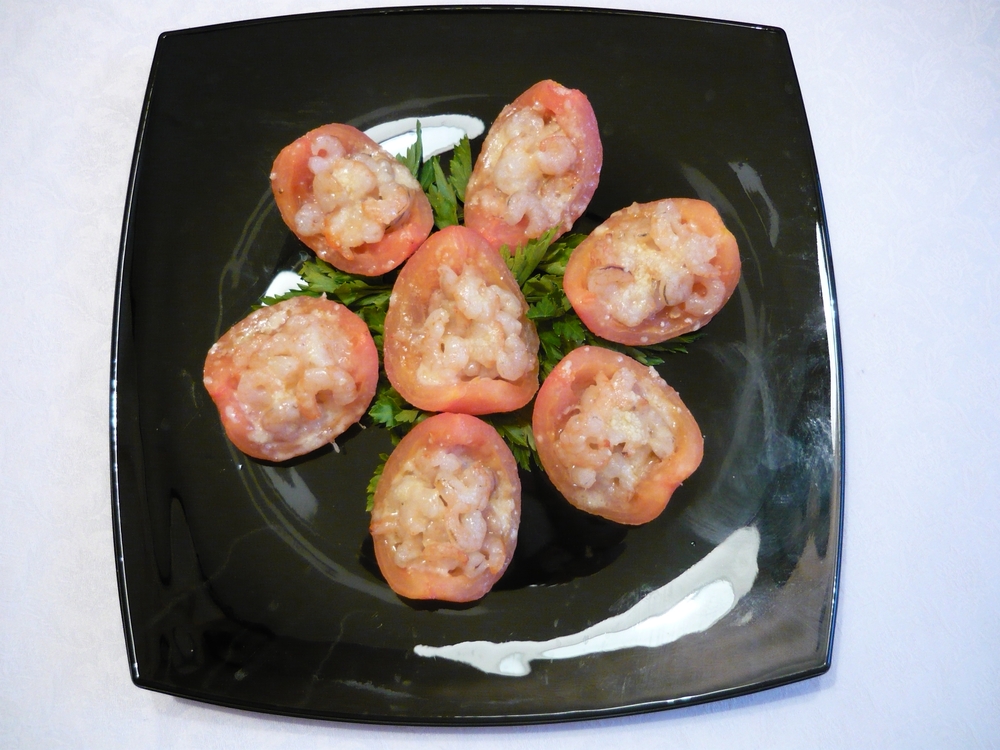 Затем получившеюся смесь укладываем на заранее приготовленные помидорки. Ставим в жарочный шкаф при t-165 на 7-9 мин